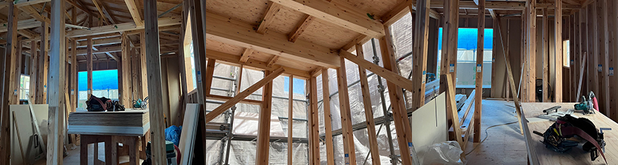 骨組みに根太などを追加し、構造用合板を張ってから、床や壁を造ります。屋根や外壁側には、透湿防水シートを施工します。こうすることで、雨が降っても構造に影響が出ないようになるのです。