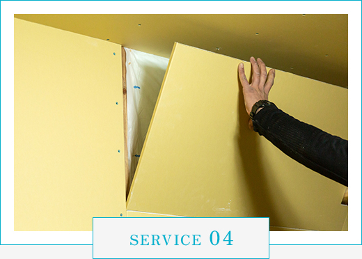 ボードを張った後は、ボード同士の境目やビスを打った部分がデコボコとしているため、次の工程に向けて内装屋さんにバトンタッチします。